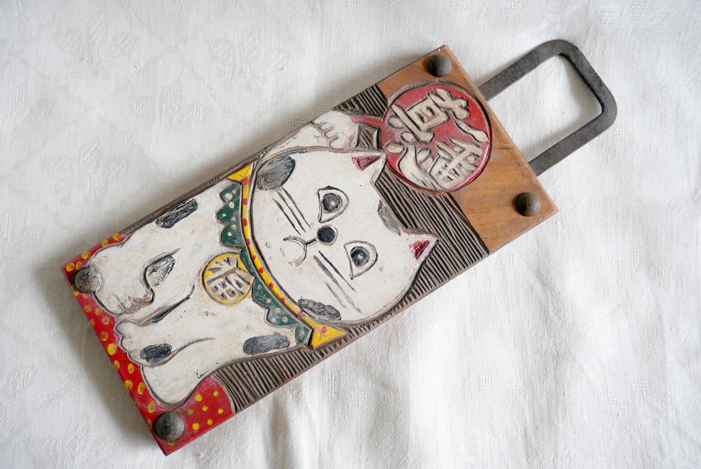 日本の骨董 招き猫「真心一番」木製手描き看板 アンティーク