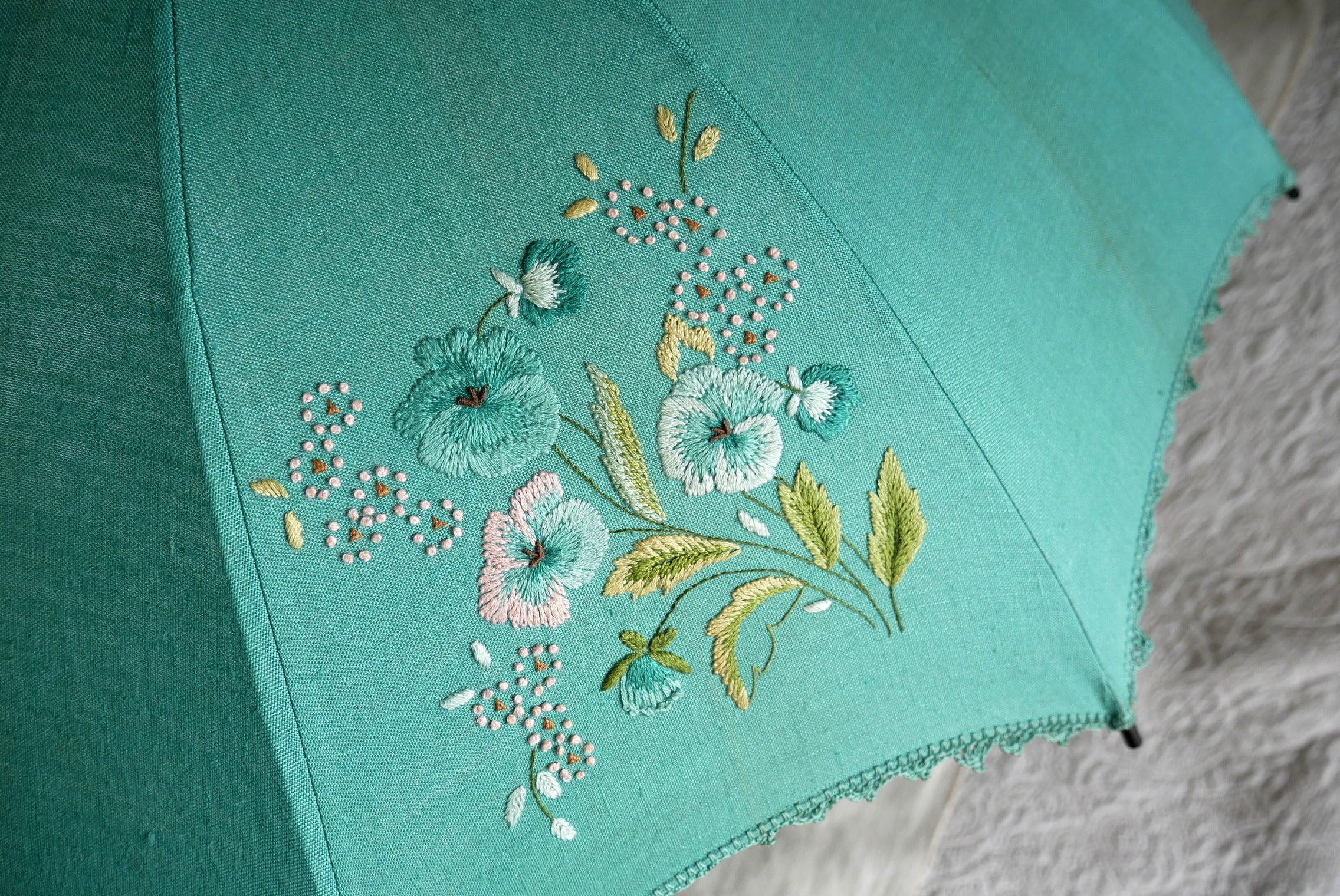 花の手刺繍飾り リネン製 日よけ傘 木製のハンドル&シャフト