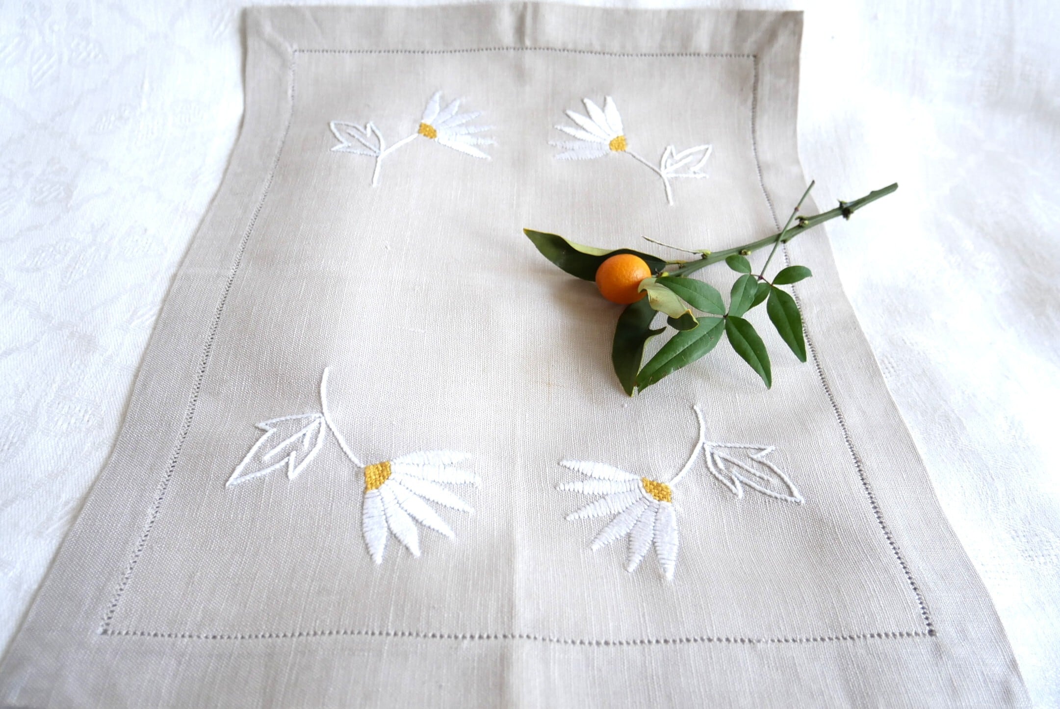 デイジーの手刺繍飾り ベージュの長方形リネンクロス