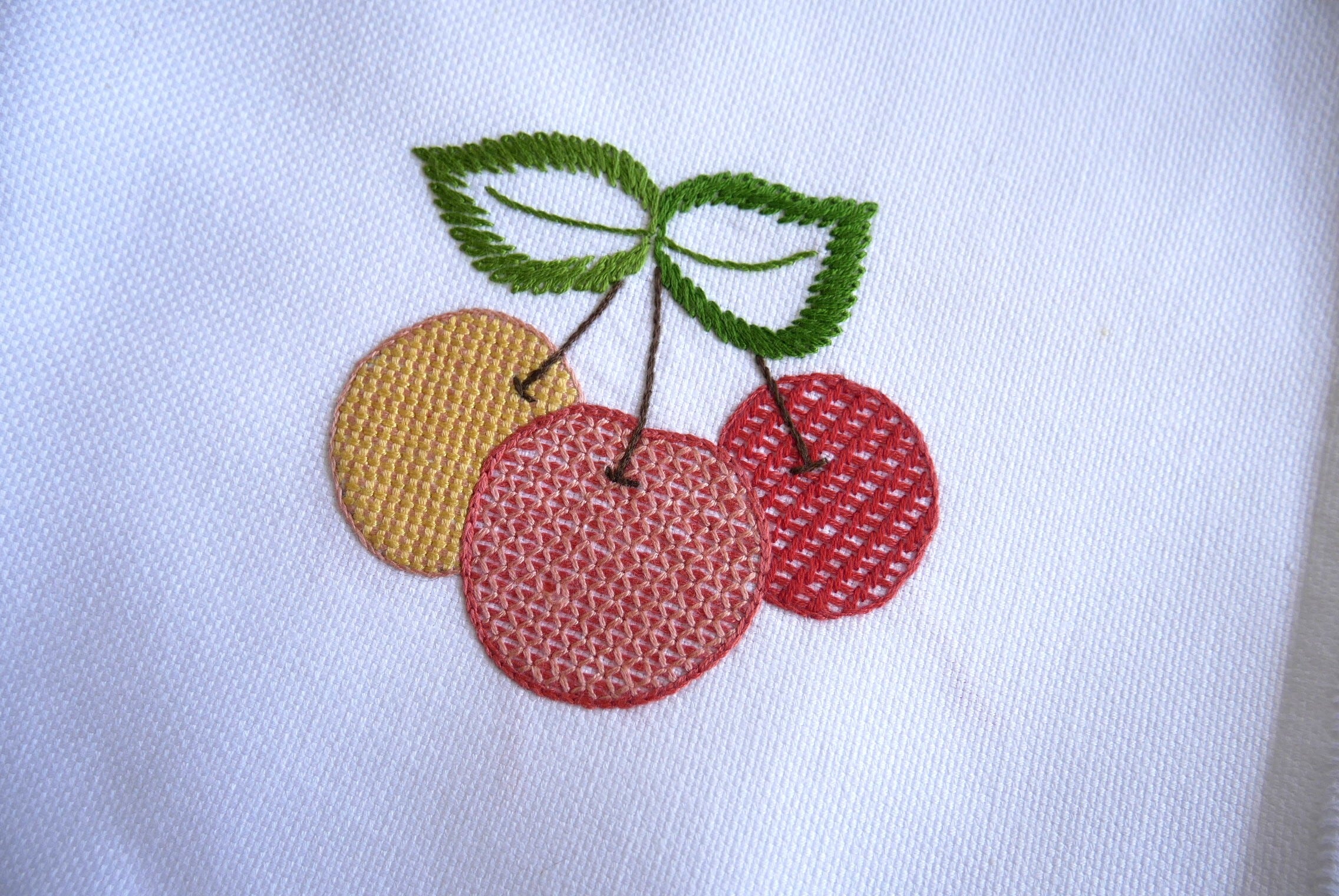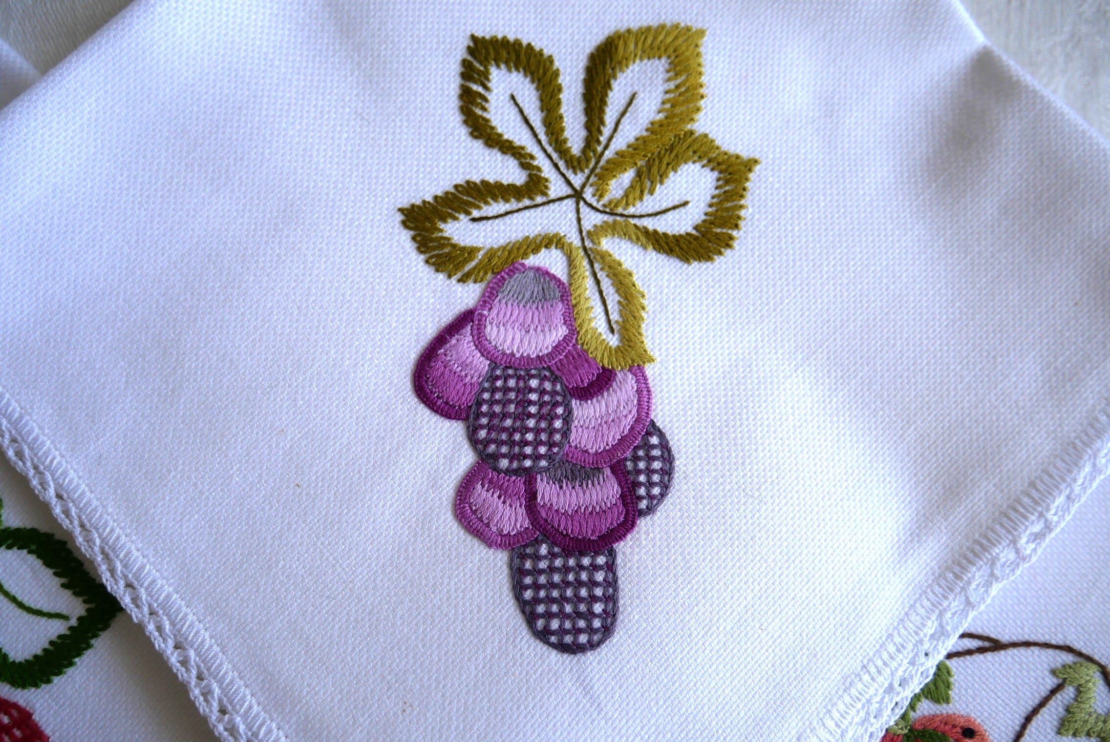 ブドウ、サクランボ、イチゴ、どんぐりの手刺しゅうで飾った
