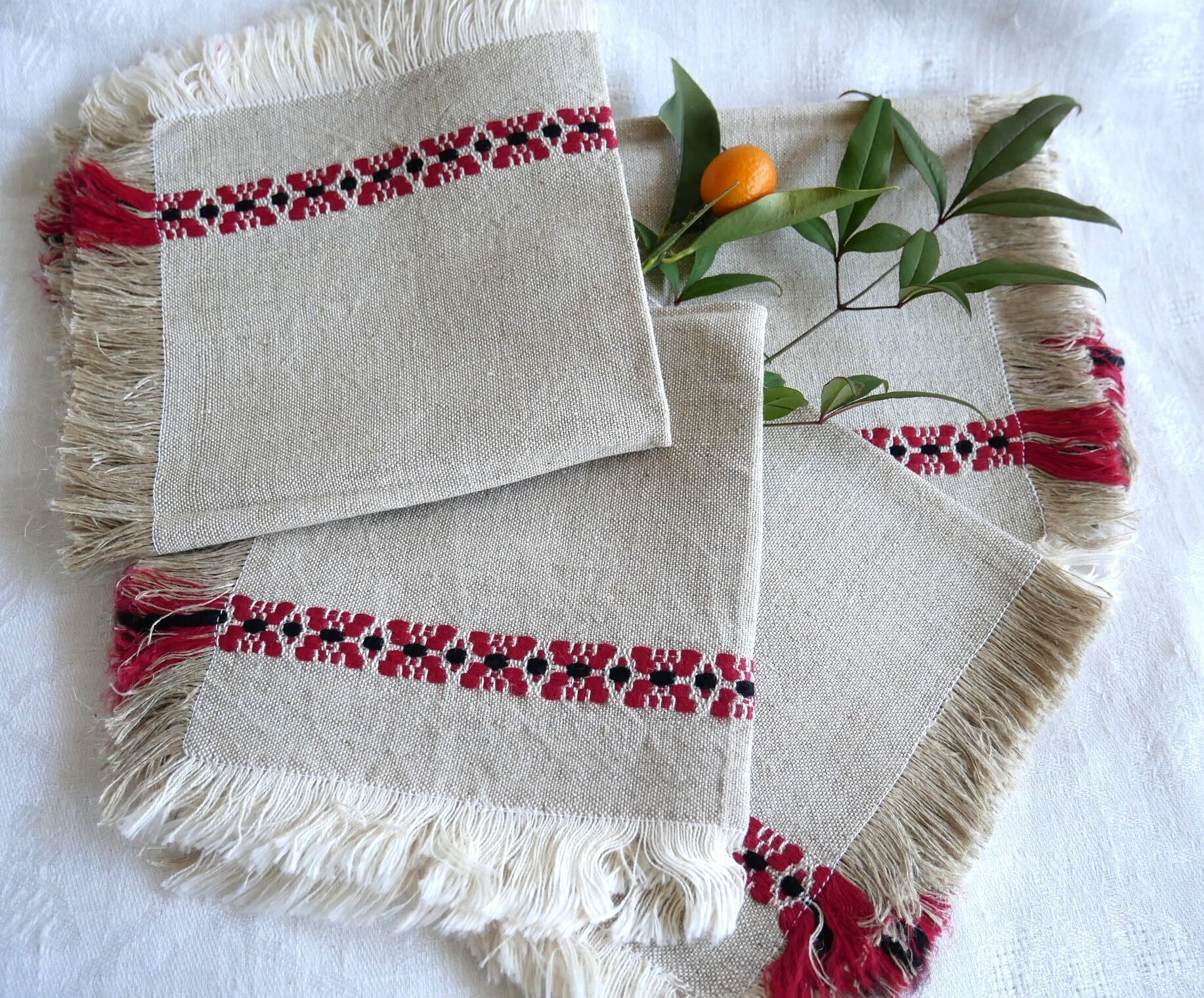 濃いベージュに赤と黒の織模様で装飾されたテーブルナプキンです。