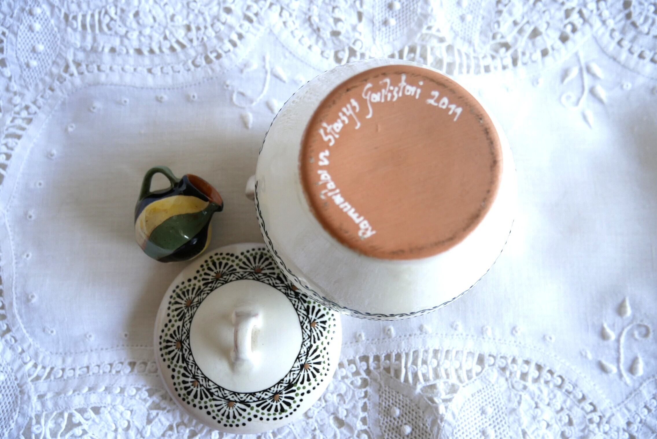 ラトビア製 陶器製 蓋付き容器と小さなピッチャーのセット