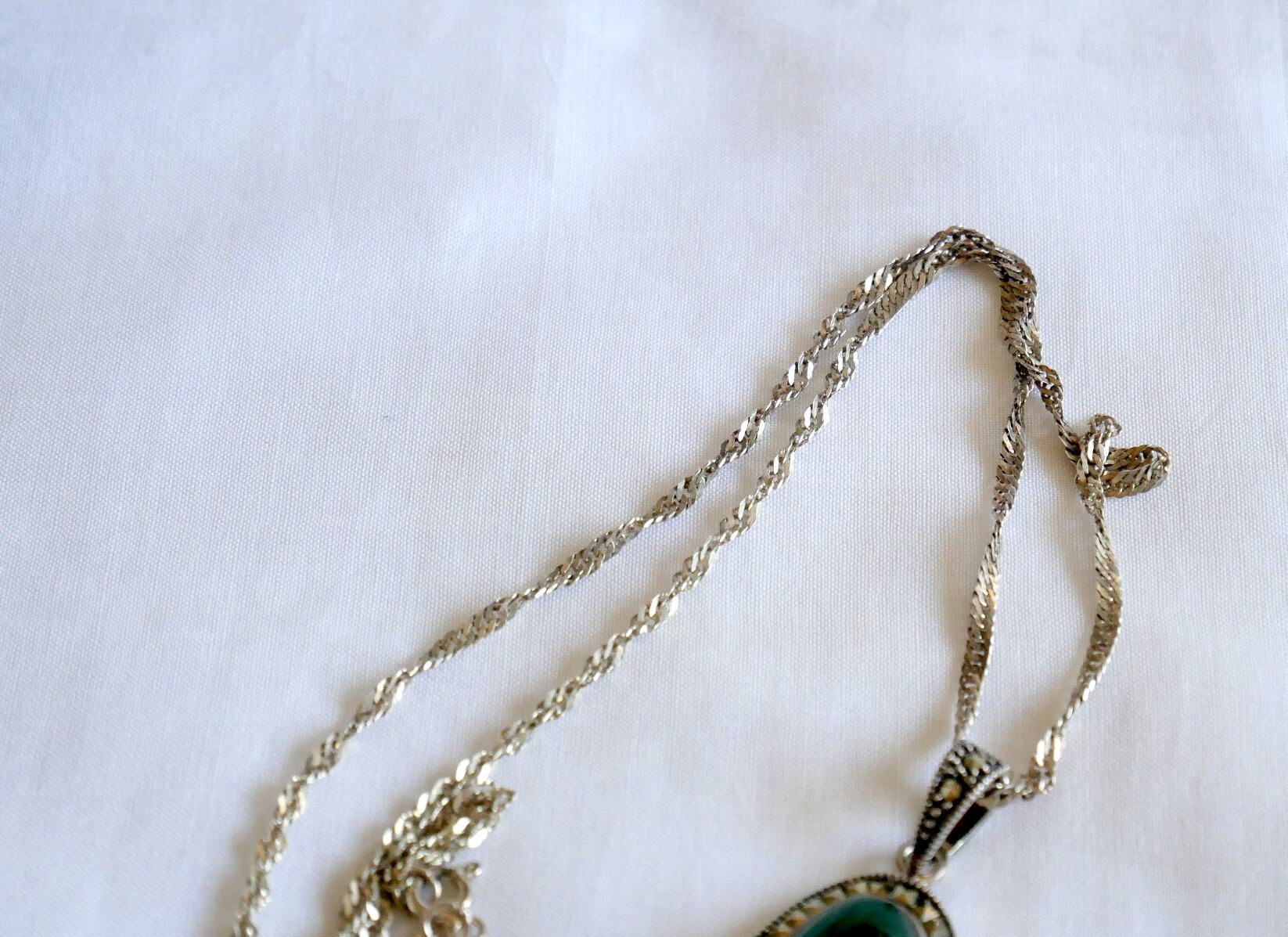 グリーンアーゲートと思われる天然石をシルバー925の金具と合わせたネックレスペンダントです。