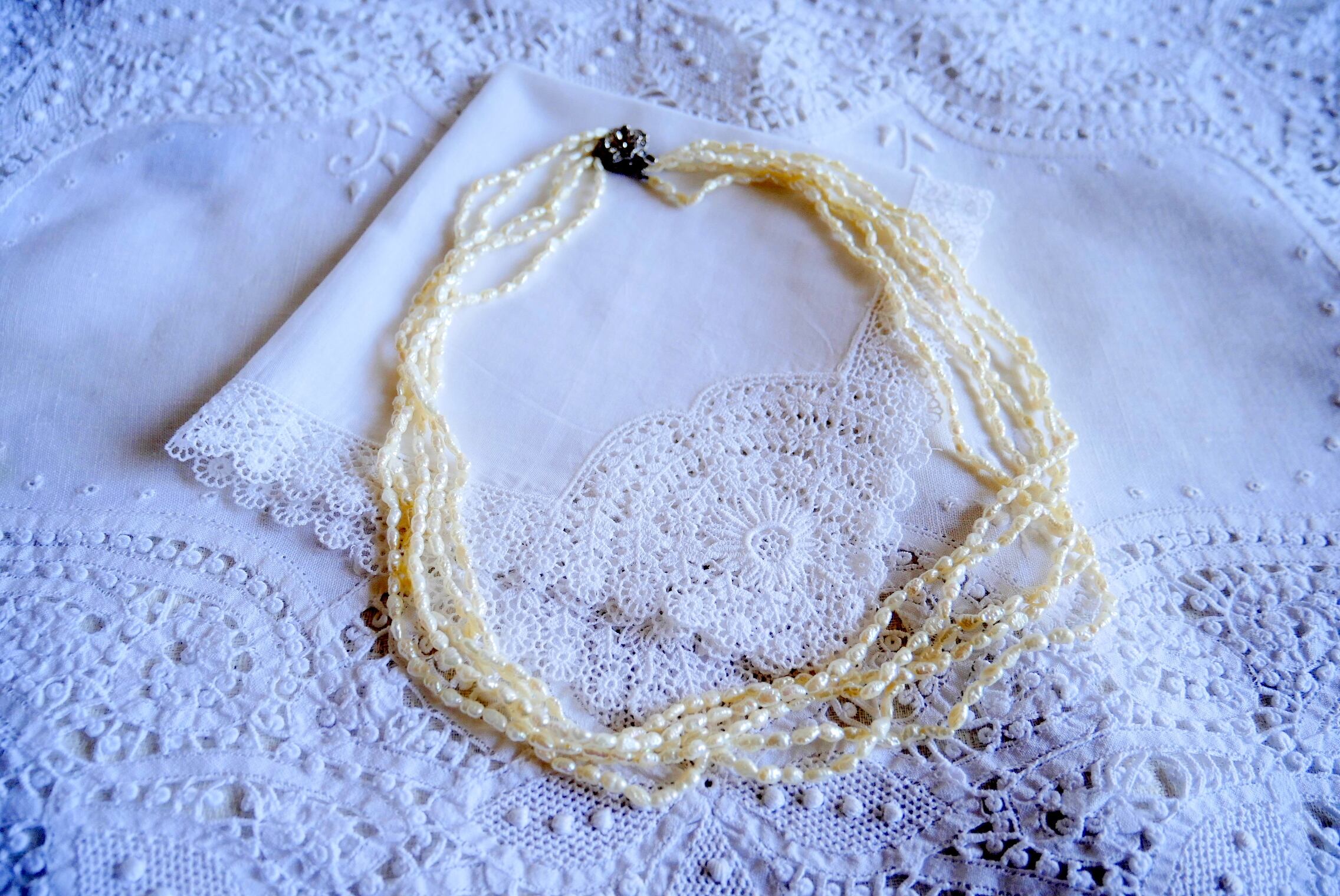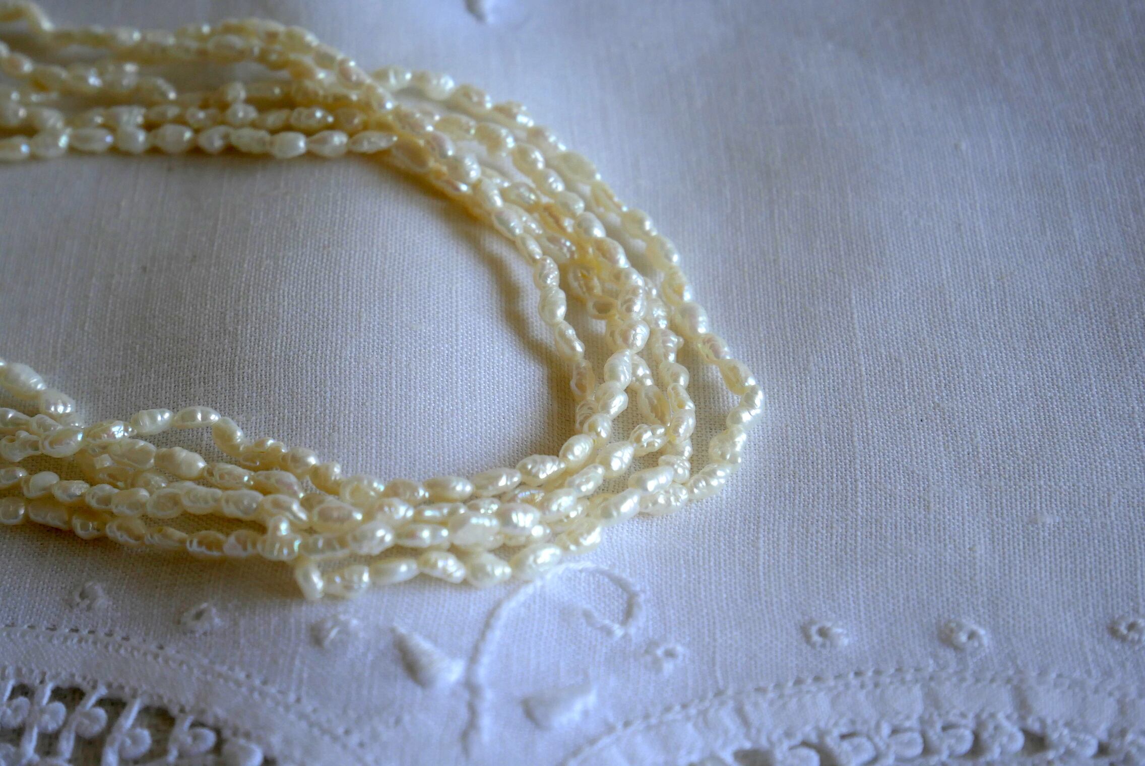 表面がなめらかでなく、凹凸のニュアンスのある小粒の淡水パールの5連のネックレスです。