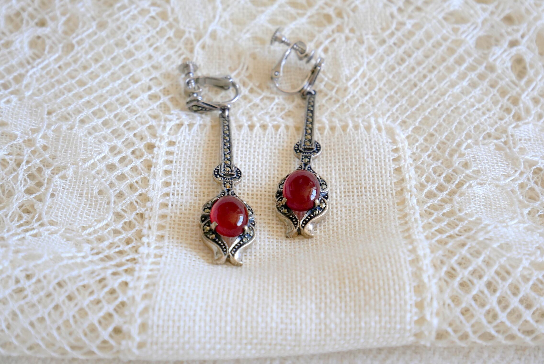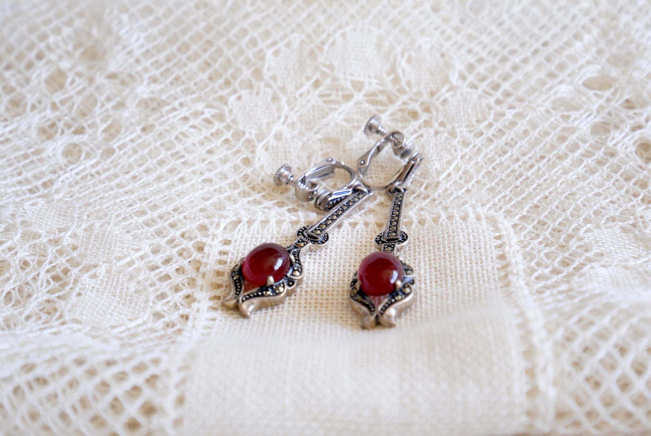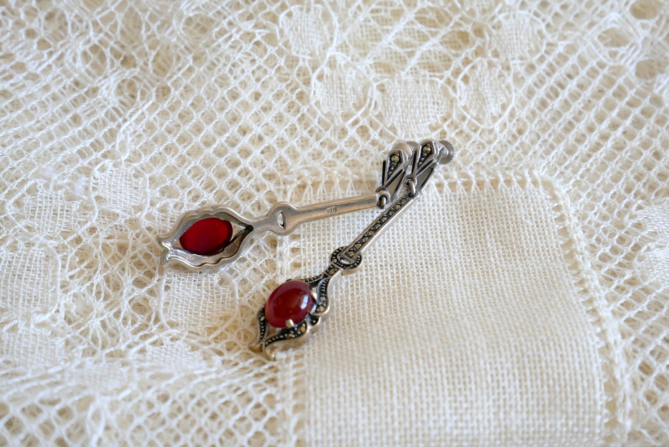 ルビー風の赤いオーナメントと細かなマーカサイトで飾られ、